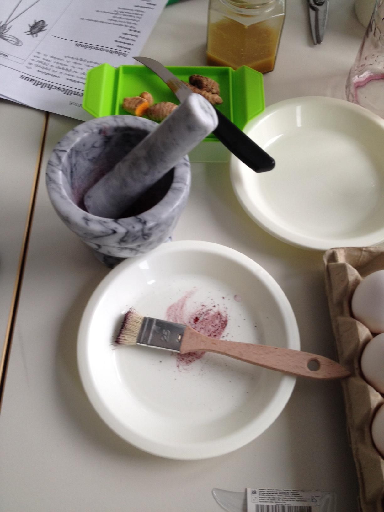 Für das Färben der Bio-Eier nutzten wir eine Vielzahl natürlicher Farbstoffe. Mit Spinat schufen wir wunderschöne Grüntöne, während Kurkuma leuchtendes Gelb erzeugte. Blaukraut lieferte zarte Blaunuancen und Cochinille brachte ein kräftiges Pink hervor. Diese breite Palette an Farben zeigte uns nicht nur die Vielfalt der Natur, sondern regte auch unsere kreative Ader an.
