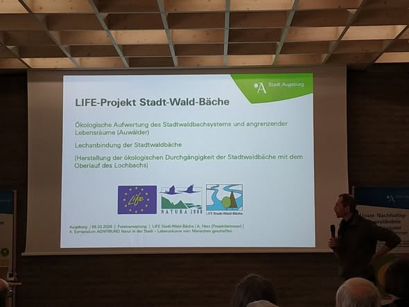 Im Themenbereich „Revitalisierung von Fließgewässern“ berichtete Alexander Herz, Projektmanager von der Stadtforstverwaltung, über den Stand und die weitere Vorgehensweise beim EU-geförderten „LIFE-Projekt Stadtwaldbäche”, bei dem es um die ökologische Aufwertung des Stadtwaldbachsystems und der angrenzenden Lebensräume, sprich Auwälder, geht.