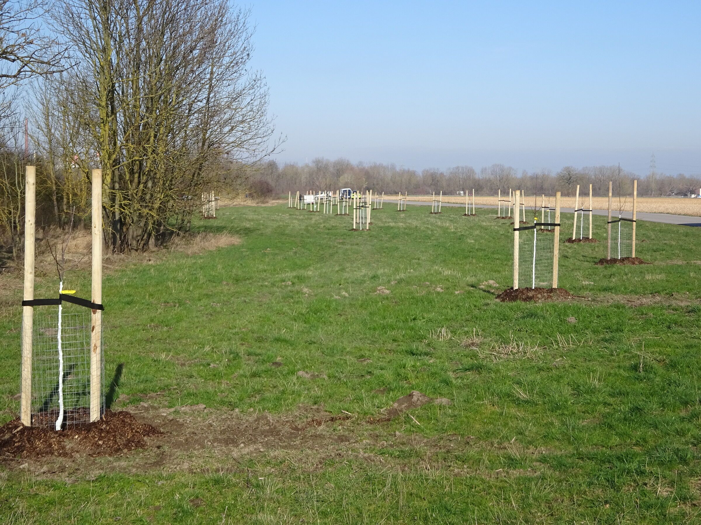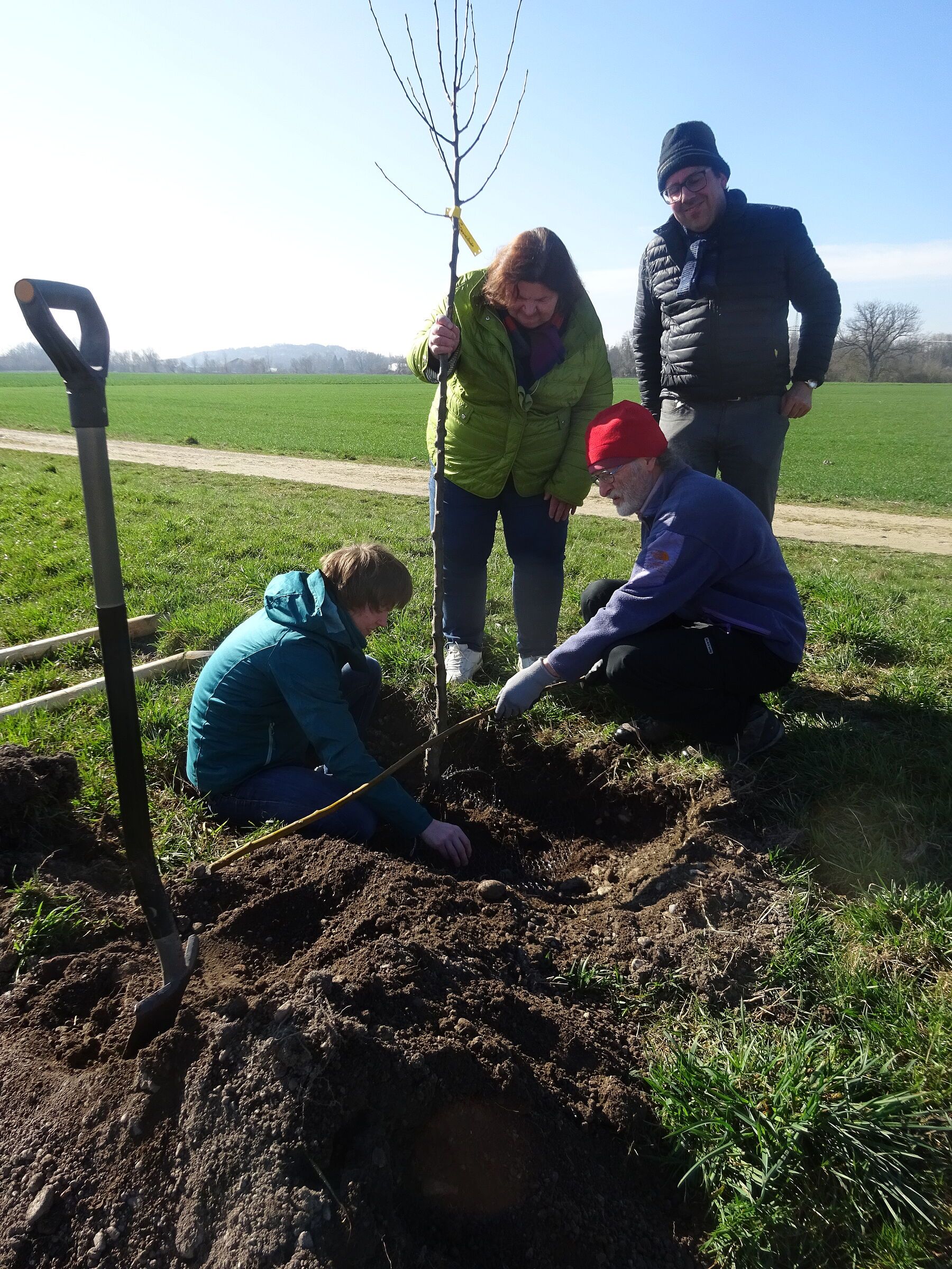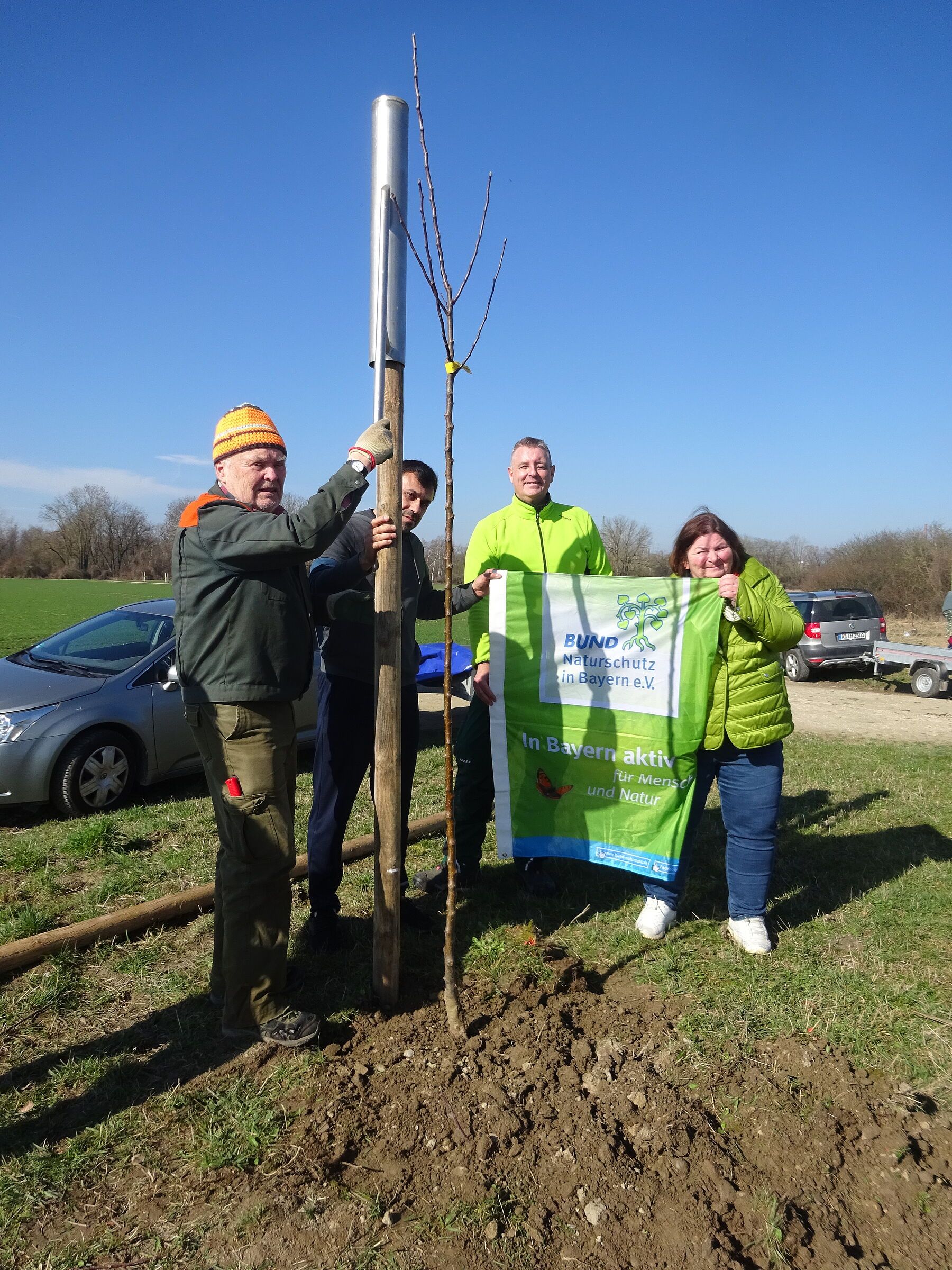 Gersthofen, 9.März - Anlässlich des 50-jährigen Bestehens der Kreisgruppe Augsburg des BUND Naturschutz, pflanzten aktive Mitglieder der Kreis- und Ortsgruppe Augsburg und der Ortsgruppe Gersthofen 10 Streuobstbäume am Branntweinbach östlich von Gersthofen. Die Aktion war ursprünglich schon im Dezember letzten Jahres geplant, musste aber aufgrund des Wintereinbruchs verschoben werden. Die Pflanzung fand in Kooperation mit dem Landschaftspflegeverband Augsburg Stadt statt, der die Bäume, Pfähle und Verbissschutzmaterial stellte. Der Freistaat Bayern fördert im Rahmen des Streuobstpakts Pflanzung und Pflege der Bäume finanziell. Nach dem Pflanzschnitt, der für die Ausbildung der Leitäste wichtig ist, wurden die Wurzeln durch Drahtgitter vor Wühlmäusen geschützt. Auch oberirdisch bekam jeder Baum einen Verbissschutz. Zu guter Letzt erfolgte ein Kalkanstrich, der Rindenschäden verhindern soll. Gepflanzt wurden alte Sorten, wie Kardinal Bea, Gewürzluiken, Rheinischer Bohnapfel und Gellerts Butterbirne. Bewusst wurden nur Hochstämme verwendet, die ein hohes Alter erreichen können und einen wichtigen Beitrag zum Artenschutz leisten. Zum Eingießen wurde Wasser aus dem Branntweinbach entnommen. Der BUND Naturschutz wird auch die künftige Pflege der Obstgehölze übernehmen. Mit einer Brotzeit für alle Helferinnen und Helfer fand die gelungene Aktion ihren Abschluss.