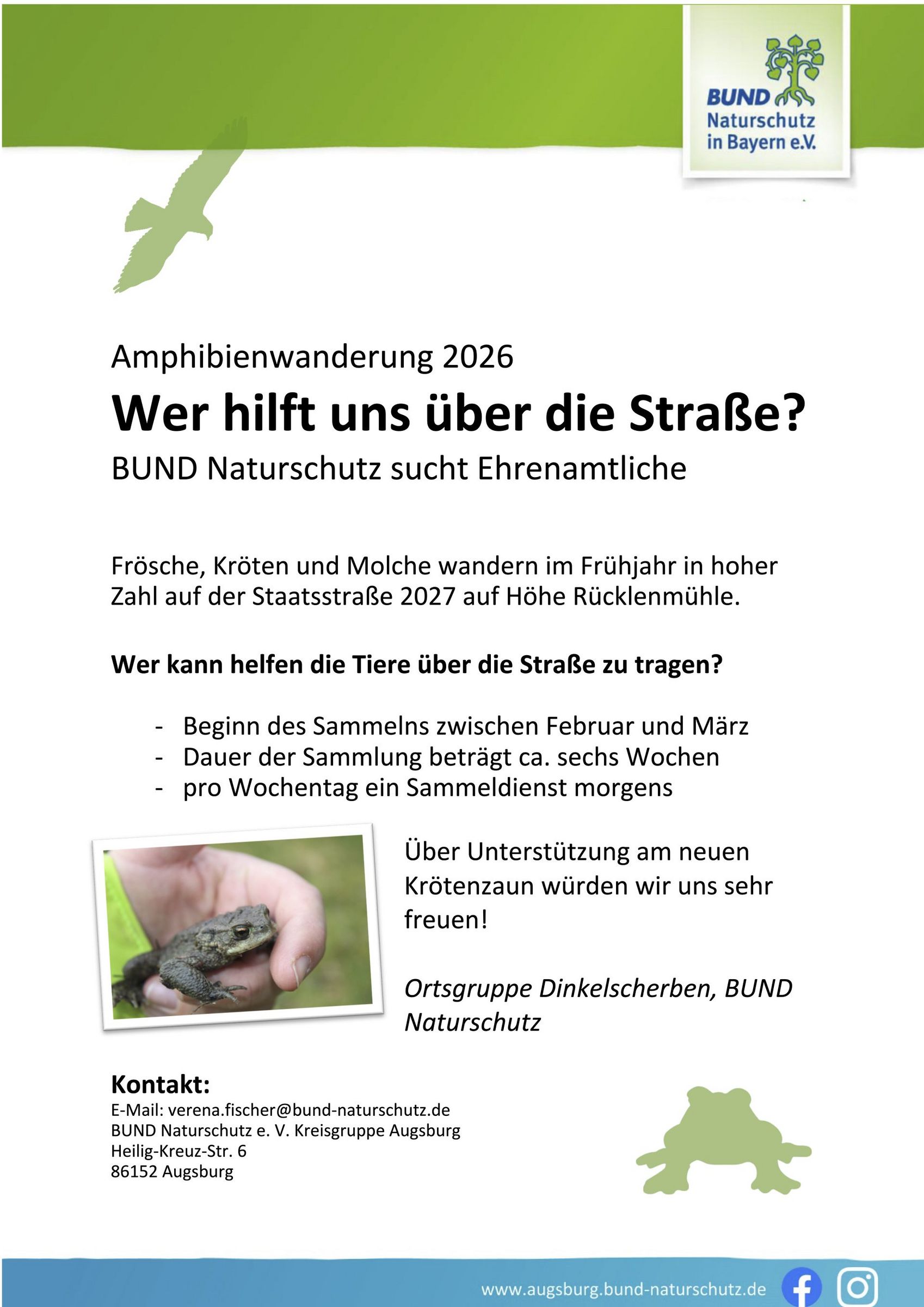 Seit Januar 2023 gibt es auf dem Gelände des Kreisjugendheims in Dinkelscherben ein neues Laichgewässer für Amphibien, ehrenamtlich geplant vom Landschaftsarchitekten Hans Marz und initiiert und finanziert von der BN Ortsgruppe Dinkelscherben. Anlass für unser Engagement waren die zunehmend ungünstigen Standortbedingungen am nahegelegenen Waldweiher. Dort sind es insbesondere die Goldfische, die von unachtsamen Gartenteichbesitzern ausgesetzt oder durch Entenanflug als Laich eingetragen werden und das Gleichgewicht im Weiher empfindlich stören, da sie den Laich und die Kaulquappen der Kröten, Frösche und Molche fressen....