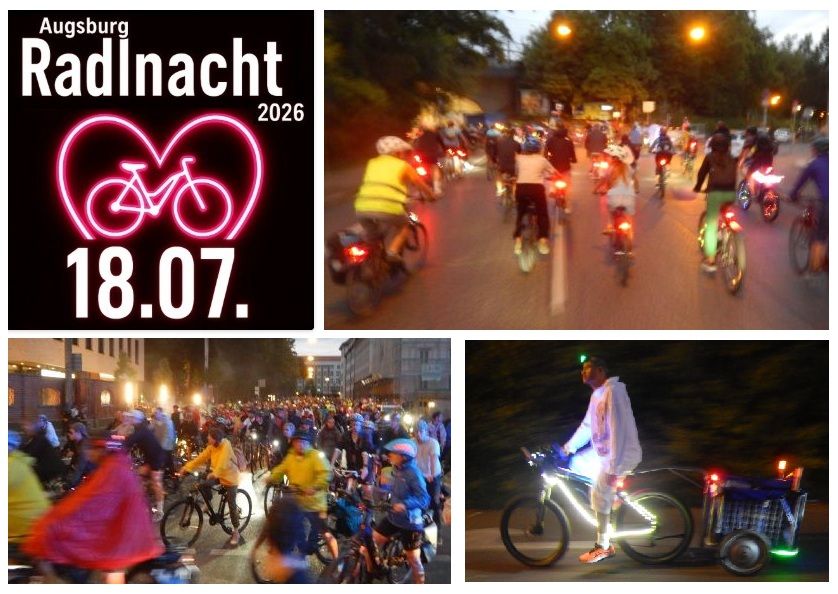 Die Augsburger Radlnacht findet am 18. Juli 2026 zum dritten Mal in Folge statt. Das ehrenamtliche Organisationsteam aus Verkehrswende-Aktivist*innen und Organisationen wie dem ADFC richtet die Fahrraddemonstration seit 2024 aus. Nach den erfolgreichen ... Sa. 20 Uhr