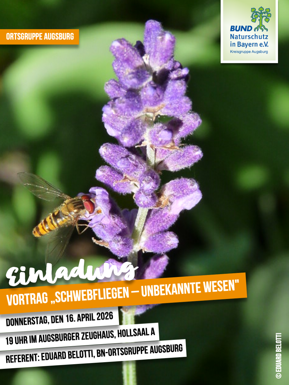 Die OG Augsburg lädt ein für einen Vortrag über Schwebfliegen - unbekannte Wesen. Sie sind nicht nur Flugkünstler, sie sind auch eine der wichtigsten Bestäuberfamilien. Etwa 70 % der Landpflanzen sind auf die Anwesenheit von Schwebfliegen angewiesen. Der ökonomische Nutzen wird je nach Quelle auf über 300 Milliarden Euro geschätzt.
