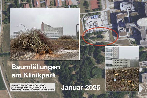 Der heutige Klinikpark entstand aus dem Aushubmaterial des bestehenden Klinikums. Für einen Neubau im Baufeld „West“ müsste dieser modellierte Park vollständig wieder abgetragen werden. Dabei fielen – zusätzlich zum eigentlichen Bauaushub für den Neubau – rund 320.000 Kubikmeter Erdmaterial an. Dies entspräche etwa 40.000 LKW-Fahrten und würde über viele Monate hinweg zu erheblichen Lärm-, Staub- und Verkehrsbelastungen führen – nicht nur für das Klinikgelände selbst, sondern auch für die angrenzenden Stadtteile Augsburgs sowie die Nachbarkommunen Neusäß und Stadtbergen.