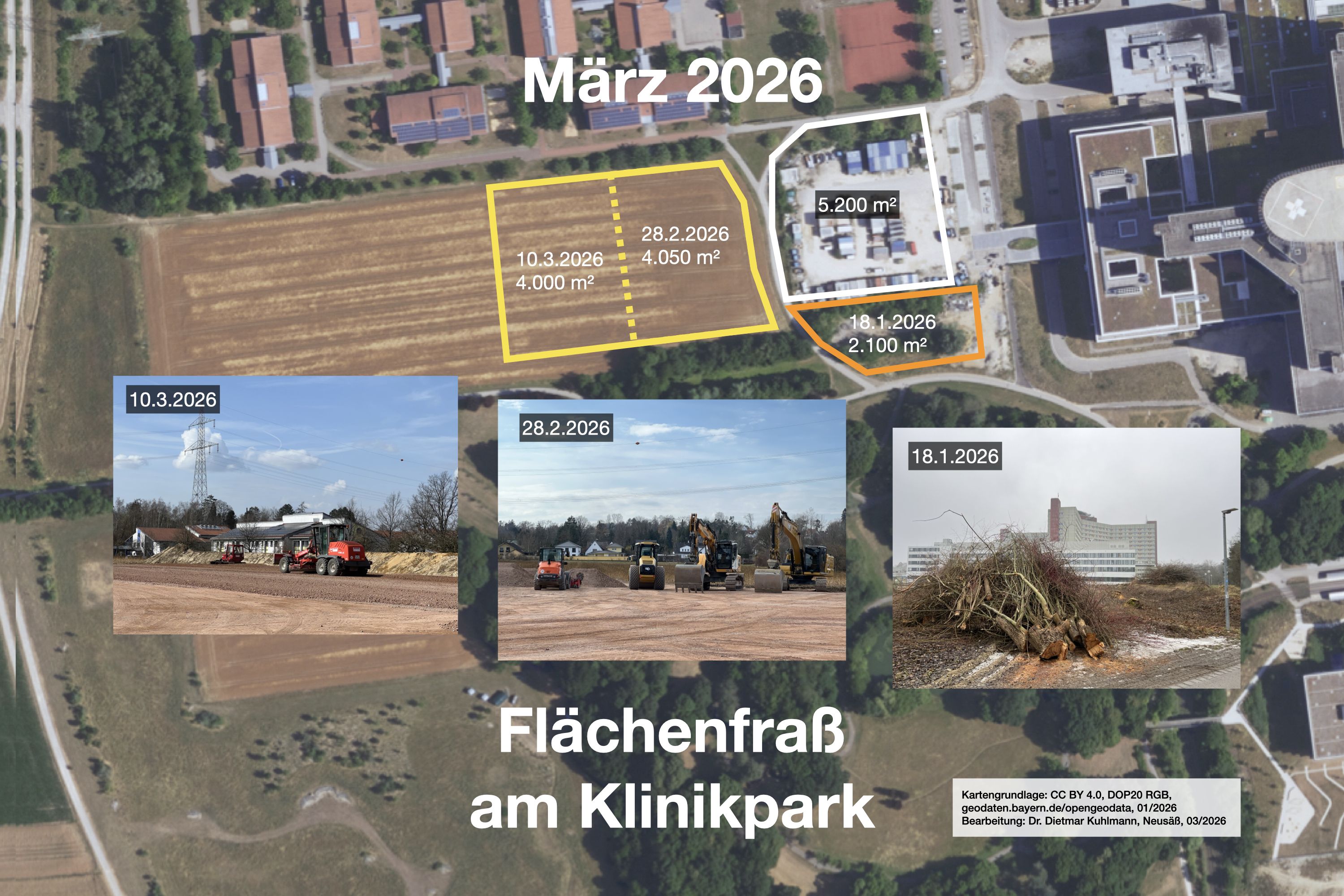 Noch im Januar berichteten wir über Baumfällungen und erste Eingriffe am Rand des Klinikparks (➜ Baumfällungen am Klinikpark). Inzwischen haben sich die Eingriffe auf den landwirtschaftlichen Flächen südlich angrenzend an das Bezirkskrankenhaus erheblich ausgeweitet.