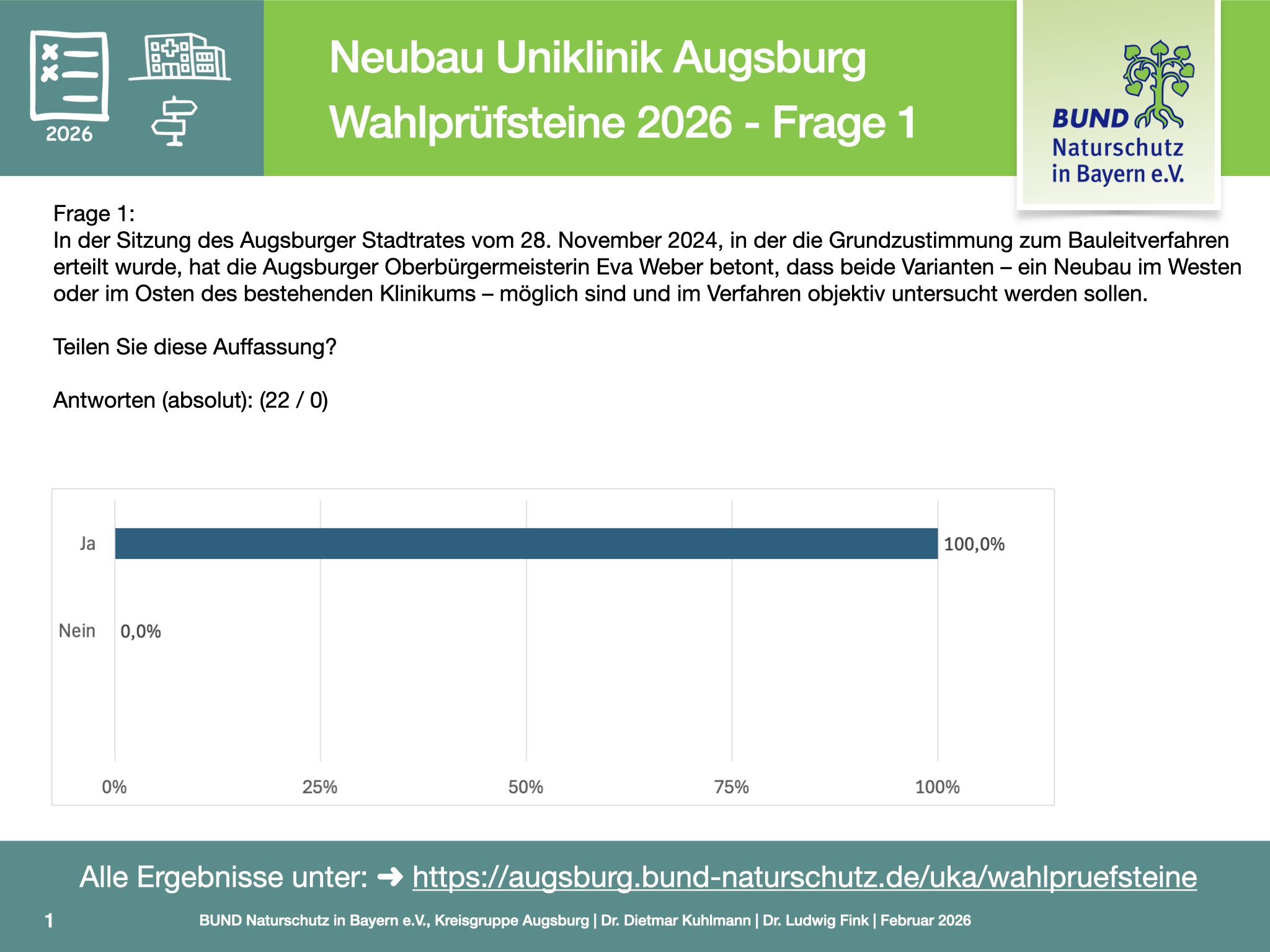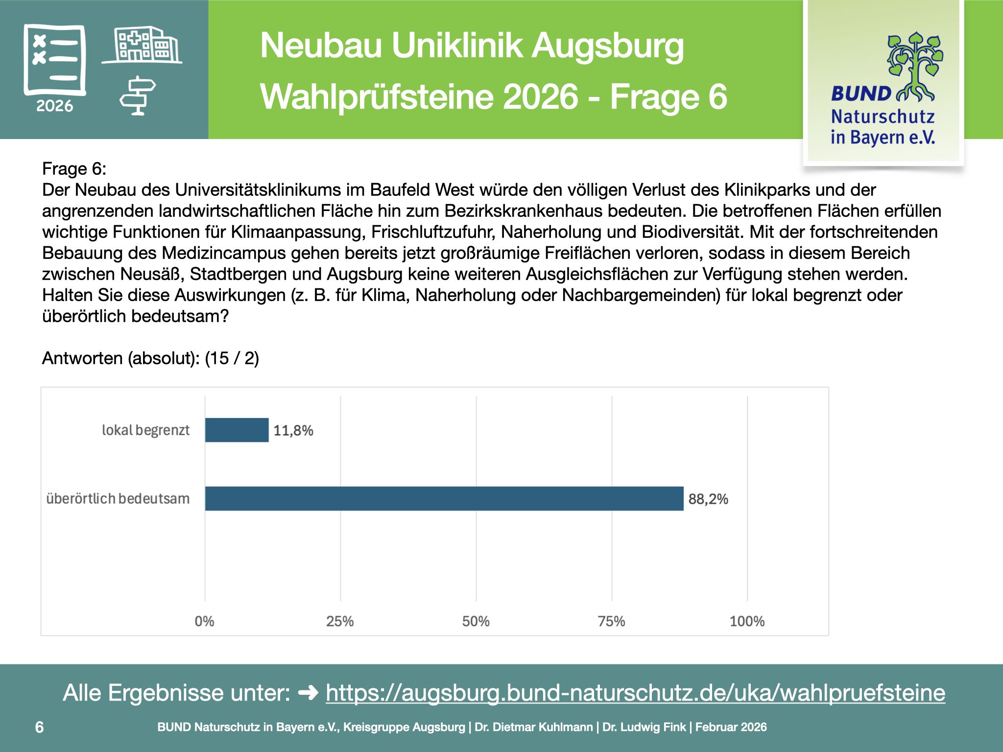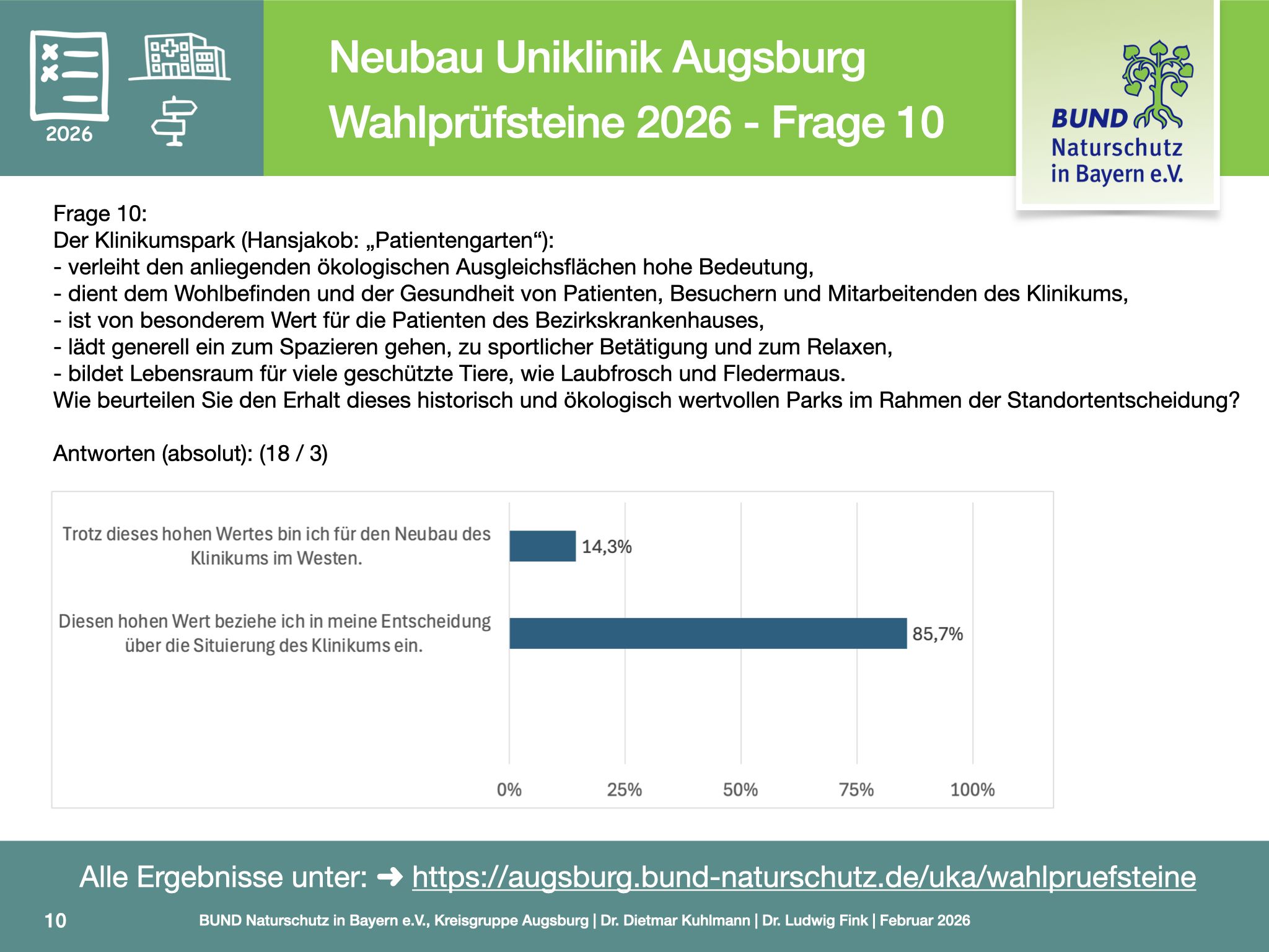 Ziel der Befragung ist es, für die Bürgerinnen und Bürger vor den Kommunalwahlen nachvollziehbar zu machen, wie sich Parteien und politische Verantwortungsträger zu einem Projekt positionieren, das medizinische Versorgung, Stadtentwicklung sowie Klima- und Naturschutz gleichermaßen betrifft.