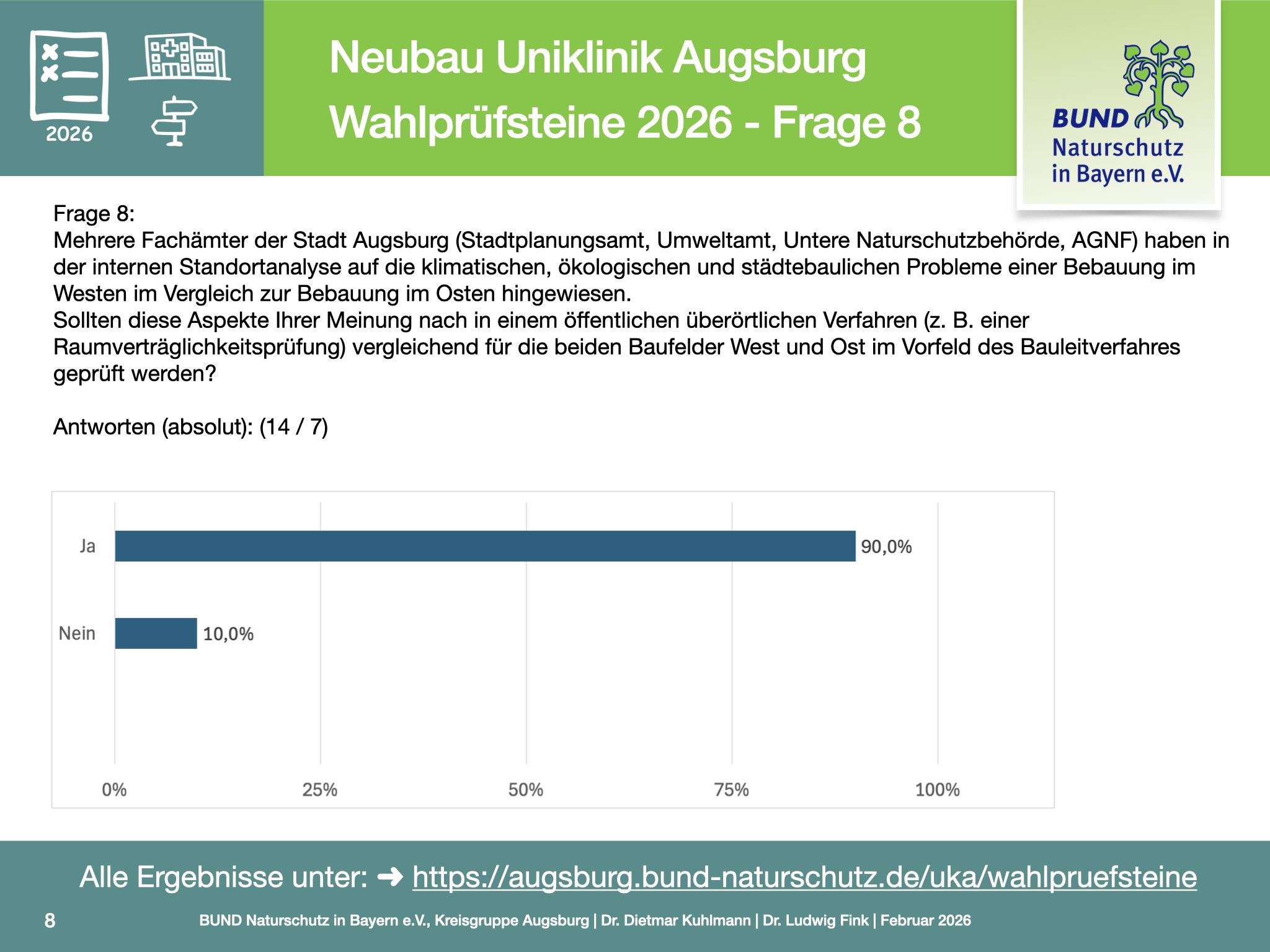 Mit der Einleitung des Bauleitverfahrens durch die Stadt Augsburg ist die Diskussion um den Neubau der Uniklinik in eine weitere entscheidende Phase eingetreten. Vor diesem Hintergrund hat der BUND Naturschutz Anfang Januar Wahlprüfsteine verschickt, um vor den anstehenden Kommunalwahlen Transparenz über die politischen Positionen zur Standortfrage herzustellen. Auf dieser Seite finden Sie die Ergebnisse dieser Befragung.